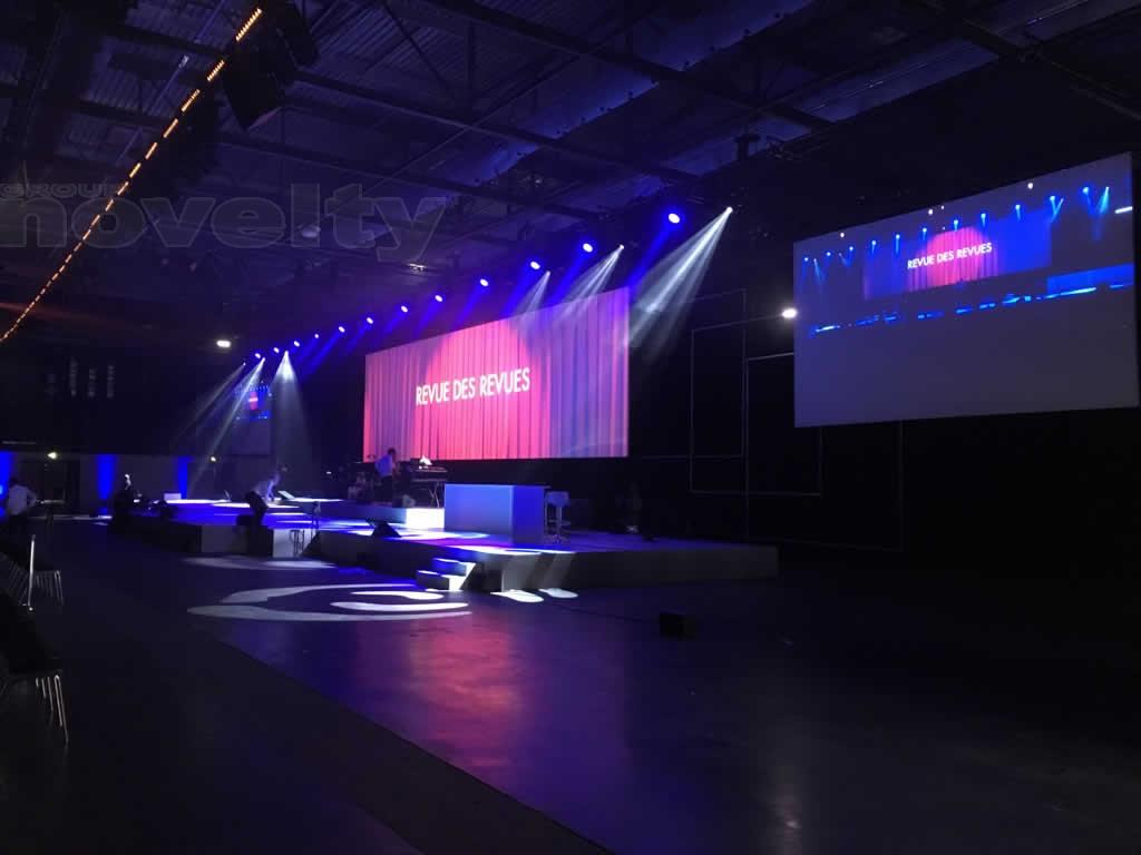 Son, lumière, structure, scène, vidéo et distribution électrique sur les 2 étages (5 400 m²), avec entre autres :