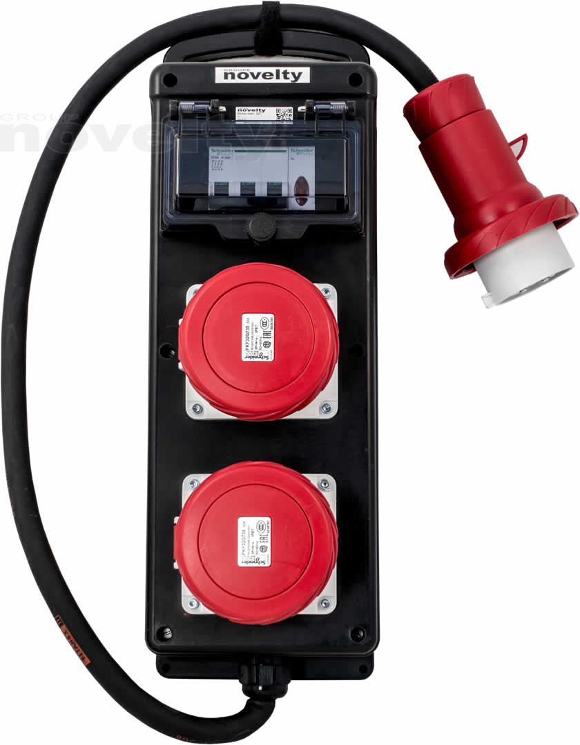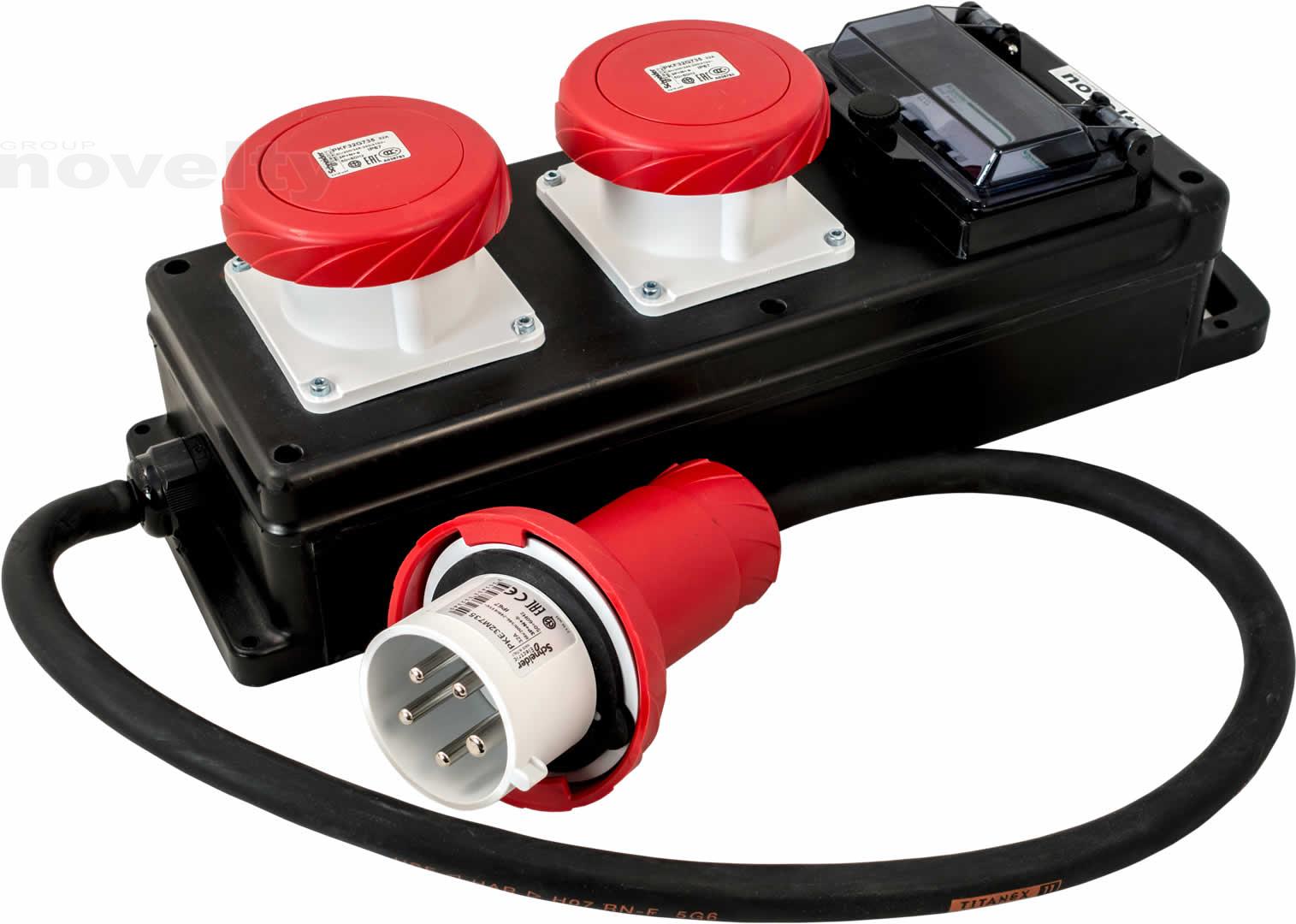 Sabot de distribution. Entrée : P17 32A tri. Sorties : 2 x P17 32tri. Protection différentielle 30mA