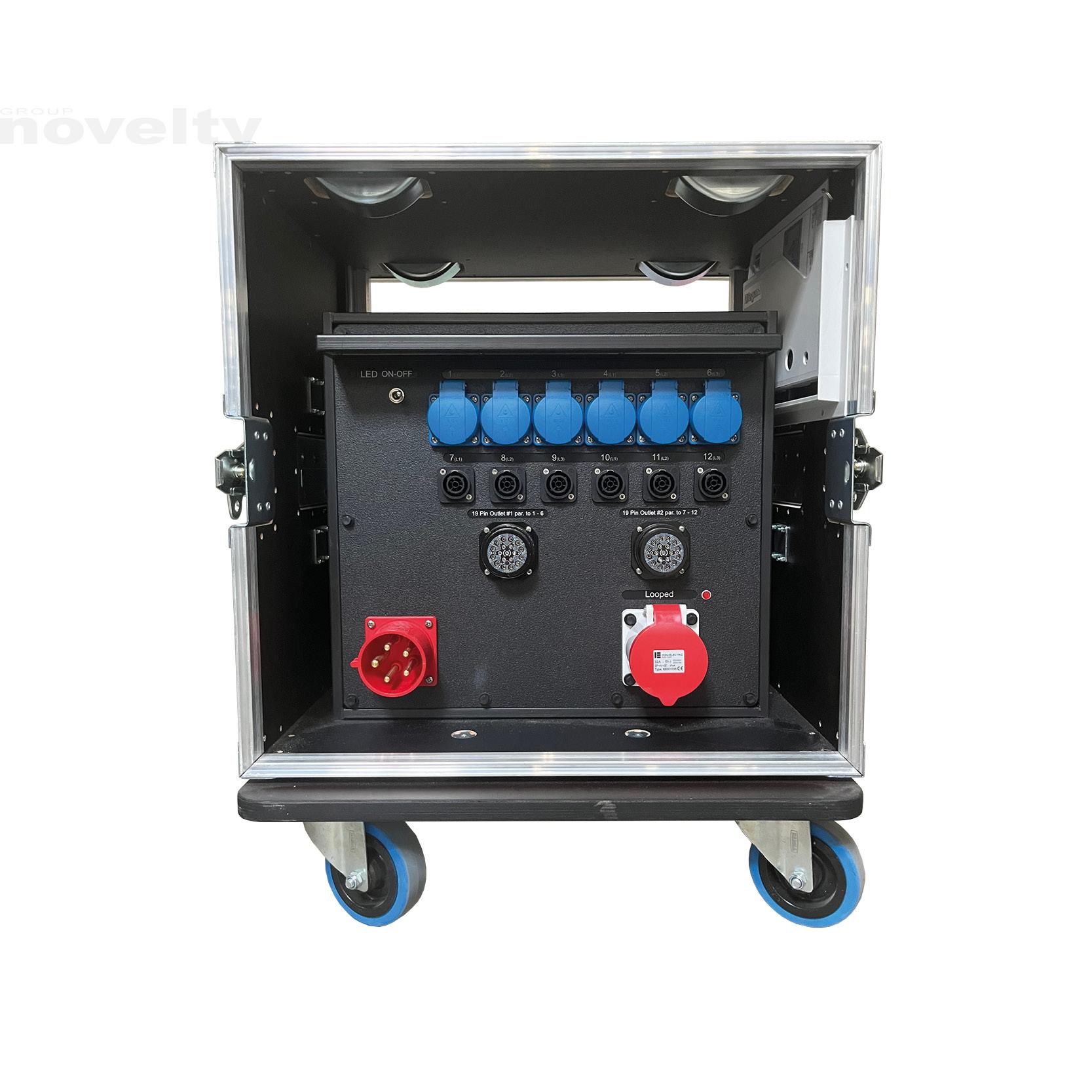 Armoire de distribution en flight-case. Entrée : P17 32A tri. Sorties : 1 x SOCA419 6 circuits + 6 x PC16A. Protection différentielle 30mA