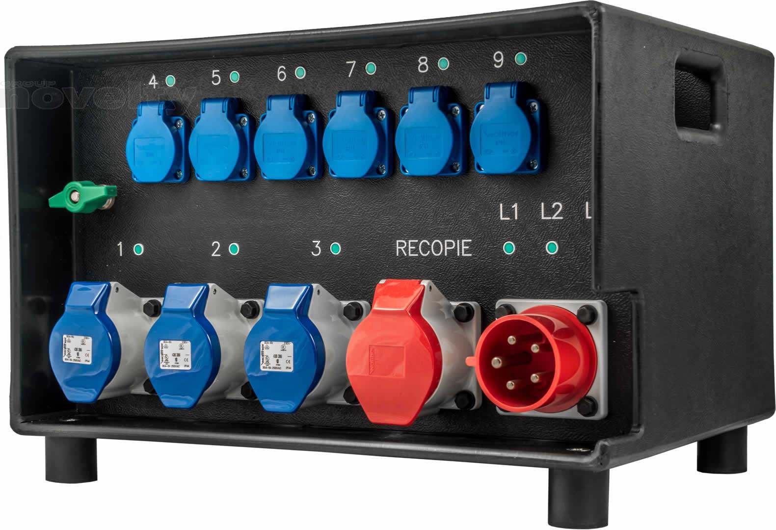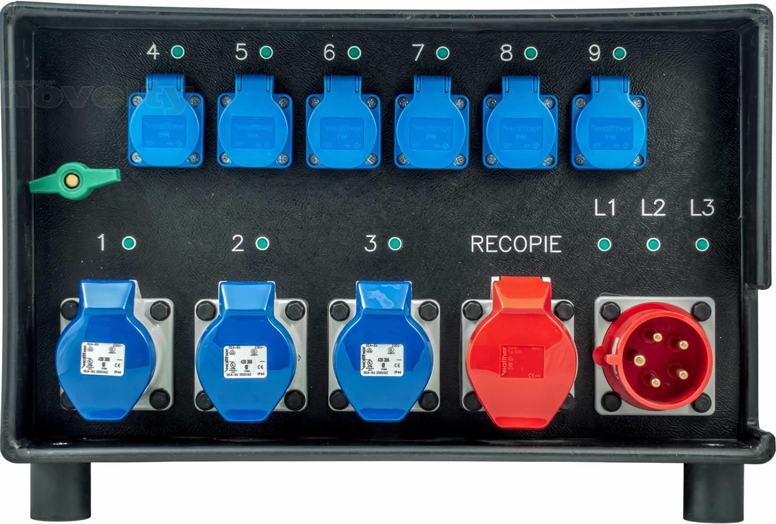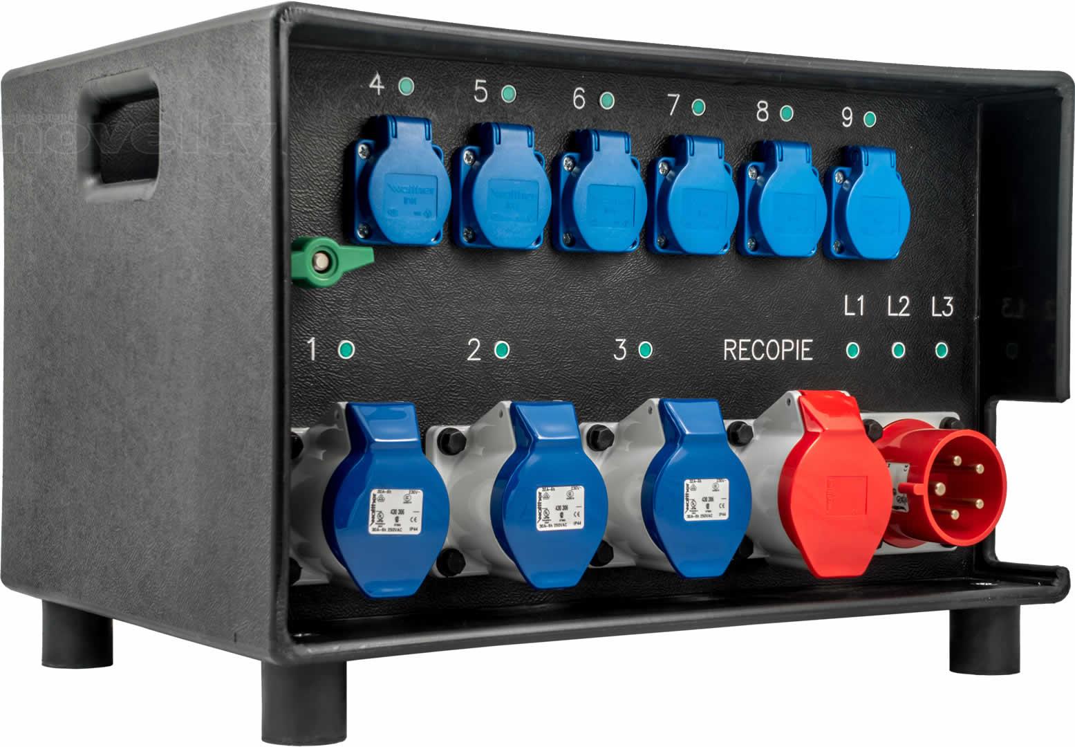 Boitier de distribution. Entrée P17 32A tri. Sortie : 3 x 32A mono + 6 x PC16A + 1 recopie 32A tri. Protection différentielle 30mA