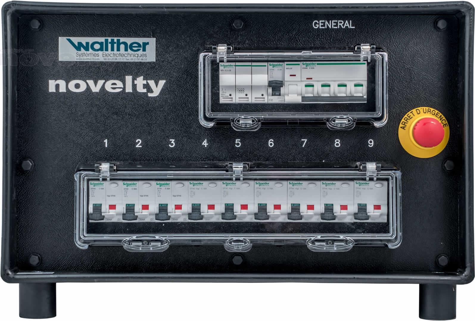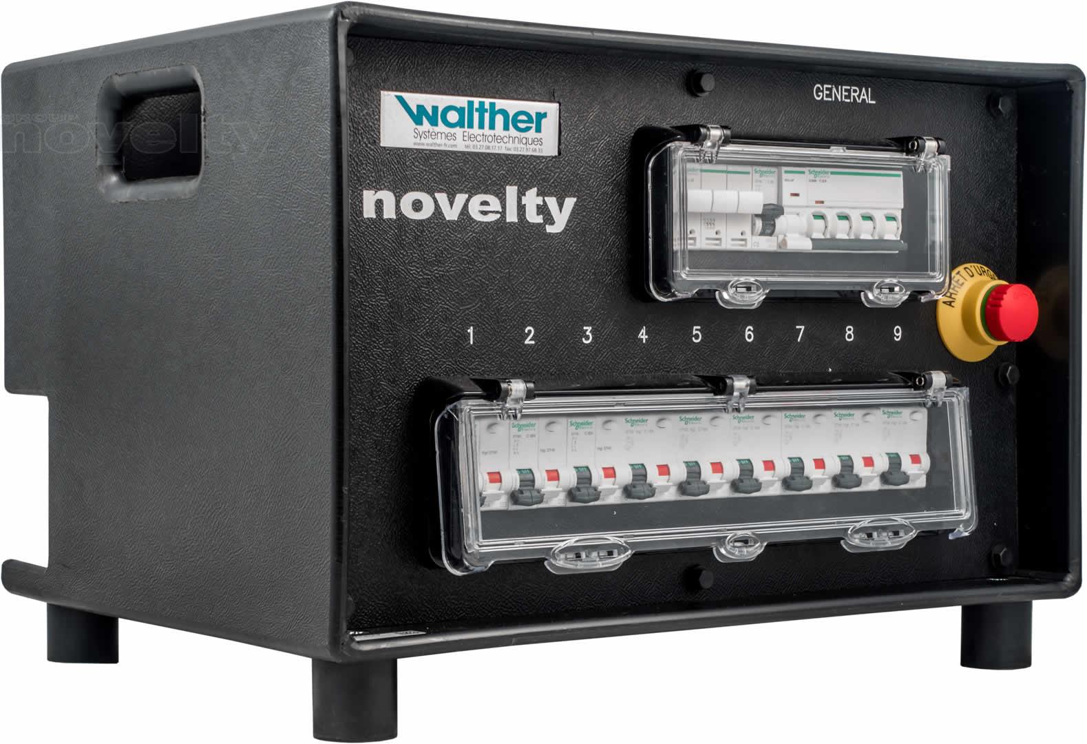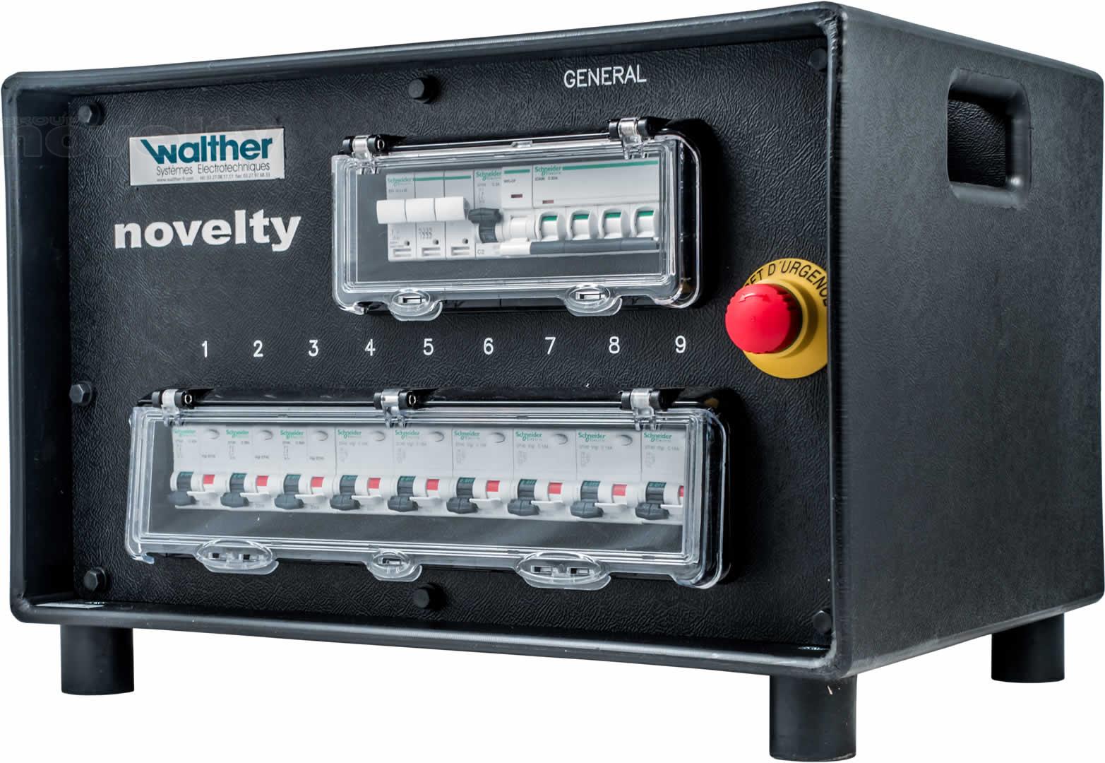 Boitier de distribution. Entrée P17 32A tri. Sortie : 3 x 32A mono + 6 x PC16A + 1 recopie 32A tri. Protection différentielle 30mA