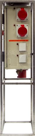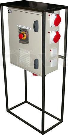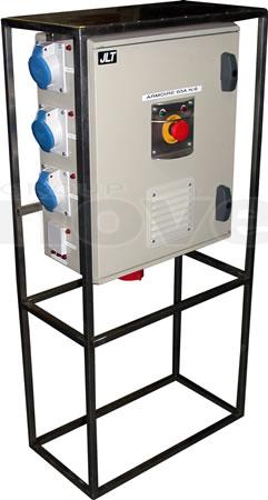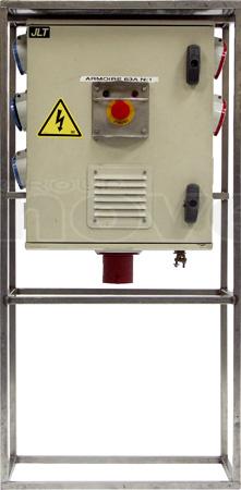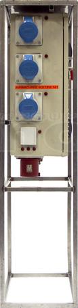 Armoire de distribution sur pied. Entrée : P17 63A tri. Sorties : 2 x P17 32tri + 2 x P17 32mono + 3 PC16A. Protection différentielle 30mA
