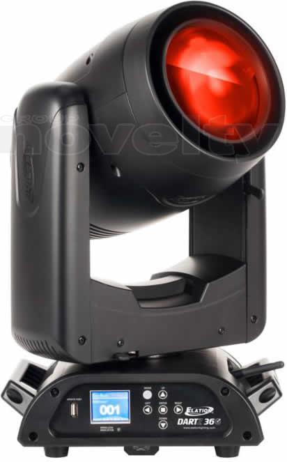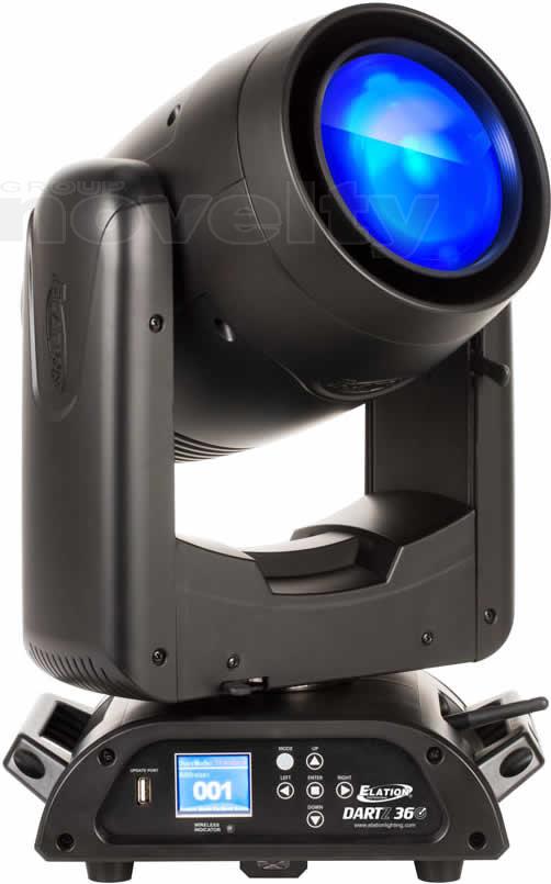 The DARTZ 360™ is a unique, compact, narrow beam luminaire featuring a new patent pending single source 50W RGB LED engine producing an impressive 3° aperture, amazing high output level, and smooth color-mixed effects that can be used in a variety of applications requiring no minimum safe project distance as with typical discharge lamp beam fixtures, fast and precise 16-bit continuous 360° pan and tilt rotation, 14 static-stamped metal gobos, 6-facet linear and 8-facet independent rotating prisms, 0-100% linear frost filter for wash effects, high speed electronic shutter and strobe, electronic dimming and variable dimming curve modes, adjustable LED refresh rate and gamma brightness for flicker free operation for TV and FILM, DMX, RDM (Remote Device Management), Kling-Net, Art-NET, and sACN protocol support, Elation’s E-FLY™ internal wireless DMX transceiver, 5pin XLR, RJ45 etherCON, and powerCON TRUE1 in/out connections, full color 180° reversible menu display with multi-button control panel, battery backup for display power, and a multi-voltage universal auto switching power supply (100-240v).