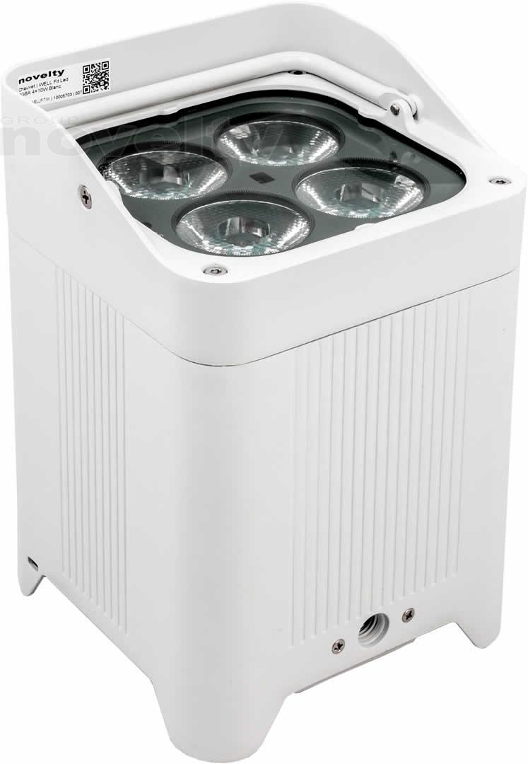 Projecteur LEDs blanc (4xRGBW de 10W), ouverture 11-18°, sur batterie (autonomie 8 à 20h) pilotable via DMX, HF, pied inclinable
