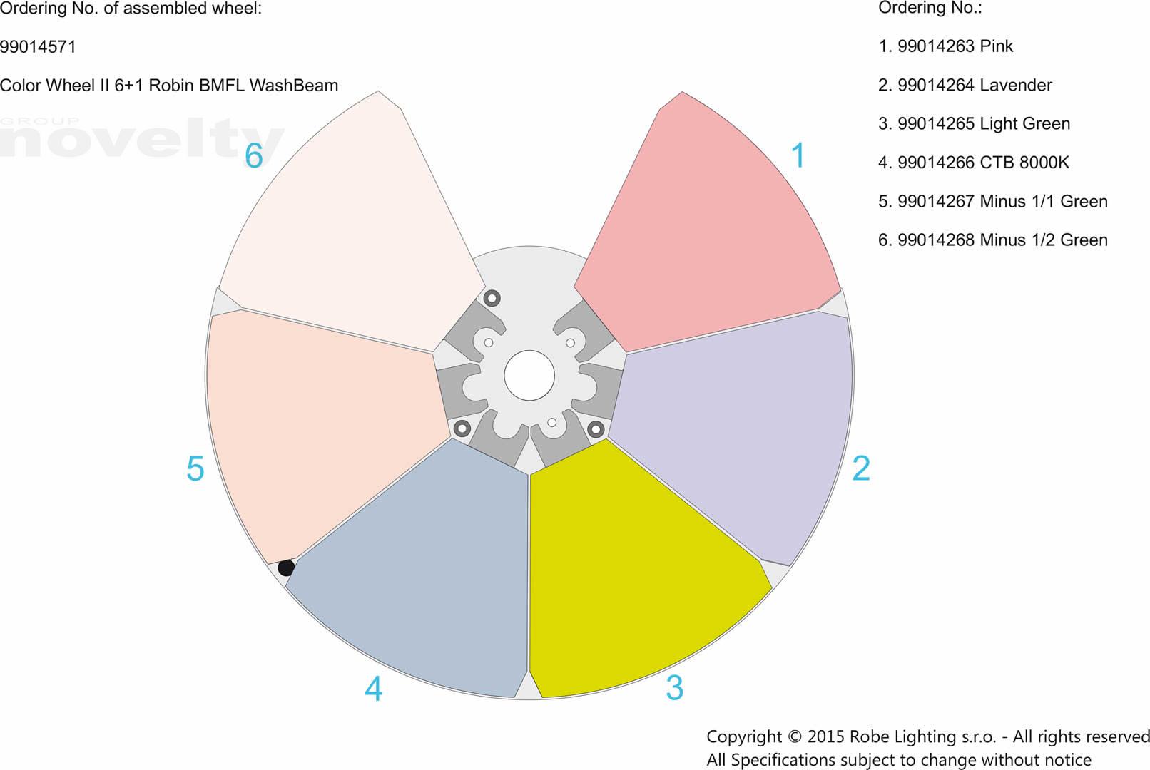 - Colour wheel 2: 6 replaceable "SLOT&LOCK" dichroic colours - pink, lavender, laser green, 9.000 K CTB, minus half and minus green + white