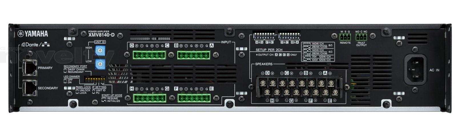 Modèle équipé de l'interface Dante pour répondre aux besoins nécessitant des distances importantes.Les installations fixes audio exigent souvent dans le même lieu des connexions en haute impédance et en basse impédance, ce qui nécessite des amplificateurs distincts, dédiés ou des transformateurs externes. Les amplificateurs de puissance XMV, cependant, peuvent fonctionner dans les deux modes : haute impédance (70V/100V ligne) ou faible impédance (4Ω/8Ω) modes simultanément. Cela élimine ainsi le besoin d'équipements supplémentaires, ainsi que la rationalisation du processus d'installation. Les amplificateurs de puissance XMV permettent un fonctionnement à la fois en 70V et 100V pour chaque paire de canaux en sélectionnant simplement le mode désiré à l'aide des commutateurs DIP sur le panneau arrière. Le fonctionnement à haute impédance nécessite souvent l'utilisation de deux canaux combinés en mode bridge, mais avec des amplificateurs XMV, le mode 70V ou 100V peut être assigné à chaque paire de canaux sans affecter le nombre de canaux de sortie disponibles.