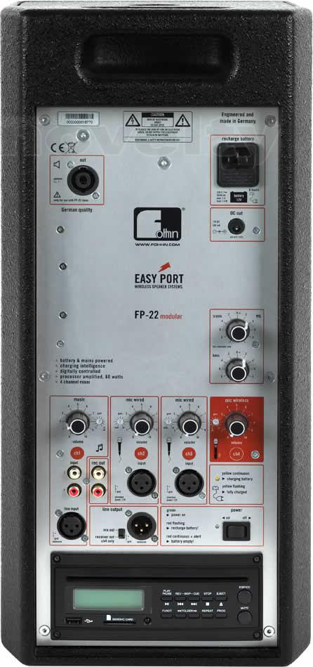 La FP-22 Modular peut être équipé d’un ou deux récepteurs HF au format 9.5”; elle est ainsi compatible avec la plupart des marques du marché, Sennheiser, AKG, Shure, Beyer-dynamic et autres. Possibilité d’intégrer votre propre récepteur après accord. Les réglages du (des) récepteur sont accessibles via une trappe avec joint acoustique situé sur le dessus de l’enceinte. On peut également intégrer un récepteur HF et un émetteur HF (pocket ou in-ear). Cela permet la sommation du signal d’une EasyPort FP-22 modular vers une autre enceinte FP-22, ou un autre système d’amplification.