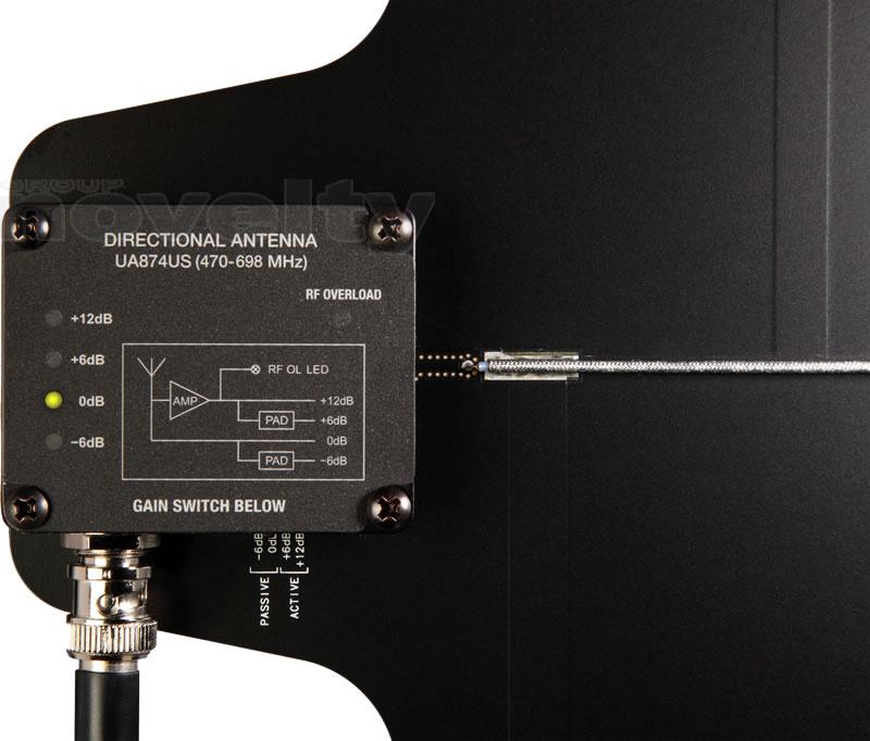 Antenne directive amplifiée large bande (470 à 698MHz). Gain antenne 7,5dBi. Gain ampli -6dB / 0dB / +6dB / +12dB commutable