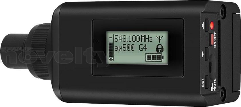 Émetteur enfichable noir puissant avec alimentation fantôme, large bande passante et puissance de transmission élevée compatible avec les systèmes de la gamme evolution wireless G4 500P. Pour des productions de film professionnelles.