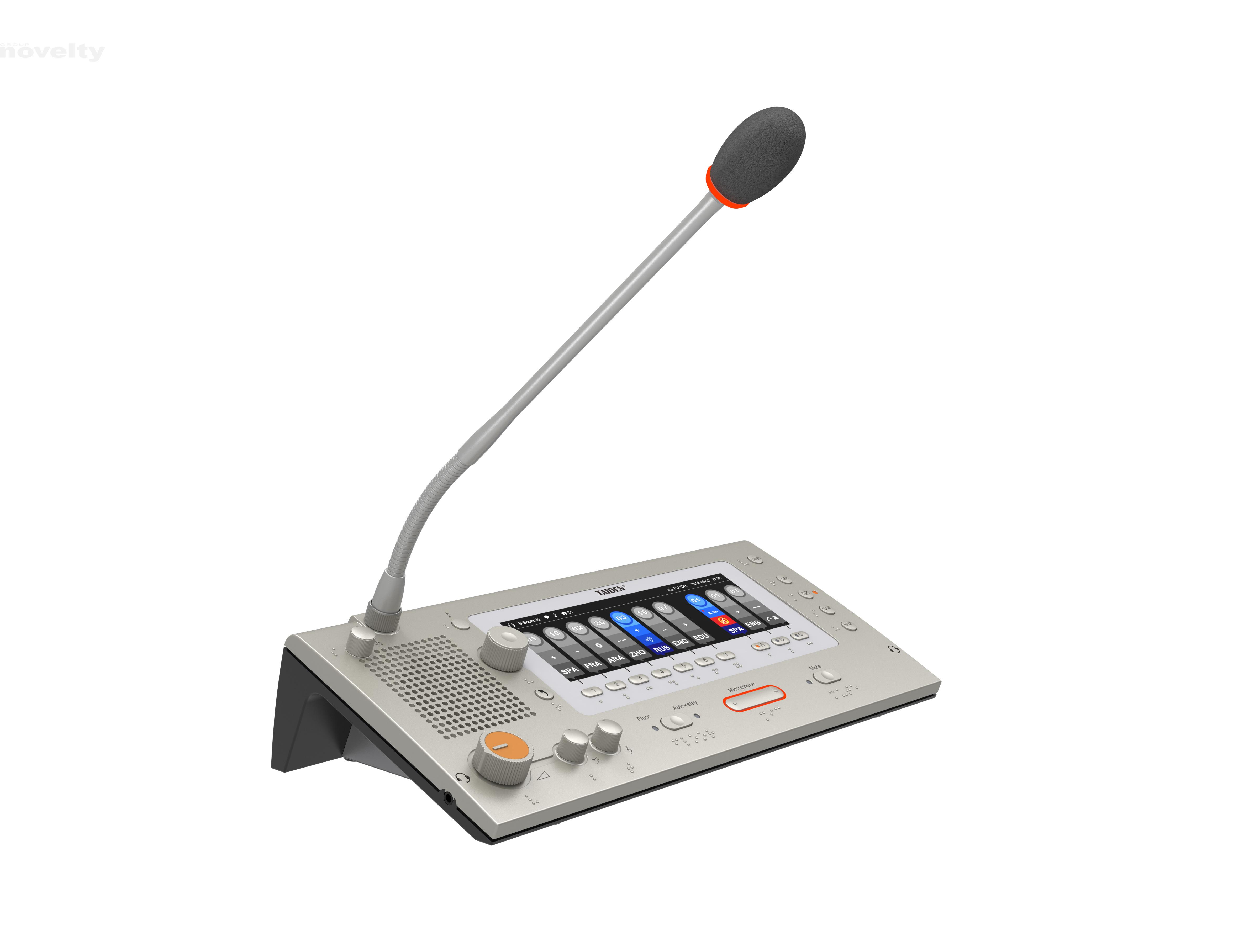 - Built-in loudspeaker with volume control and when all microphones are off, the loudspeaker will play floor language or interpretation channel