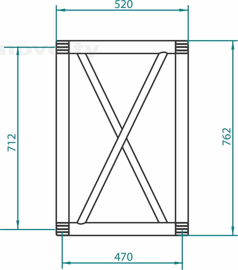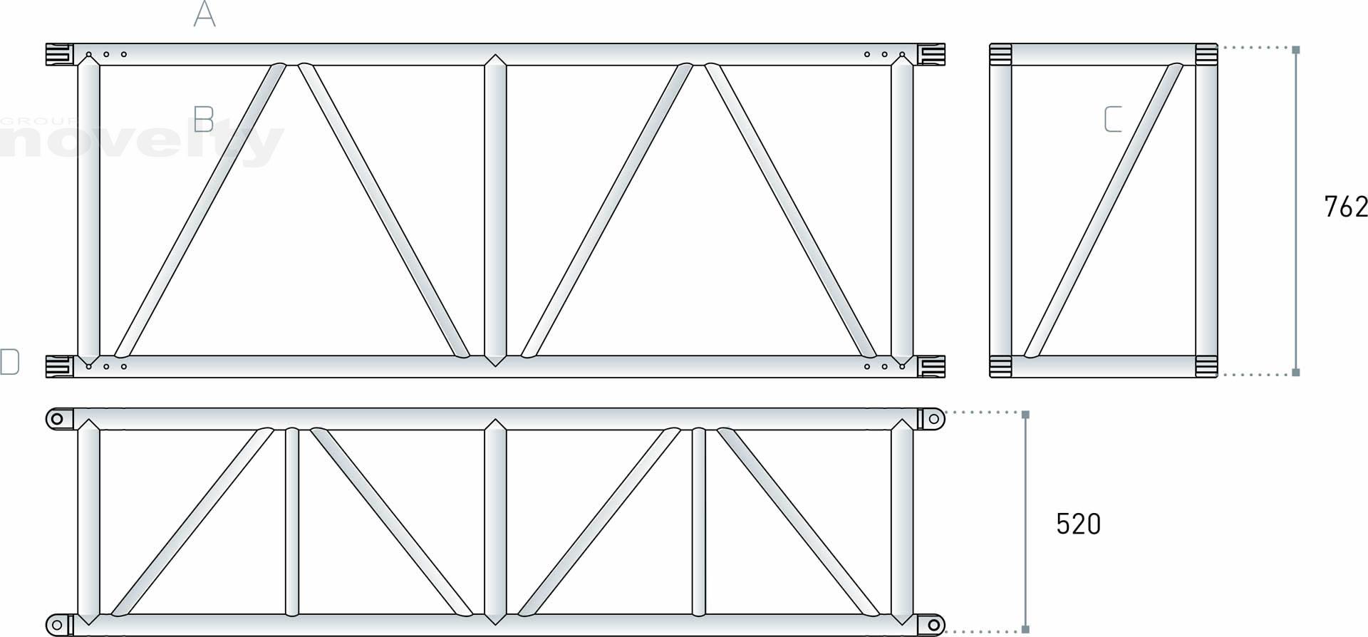 Rectangular section High Load aluminium truss with 76x52 cm long sides. It is diagonalized on all faces and is provided with steel fork connections. It ensures high load capacity on medium-long spans thanks to the design of its main components.