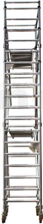 Tour échaffaudage simple largeur, 4m avec escalier, garde-corps et stabilisateurs. Livrée en chariot.