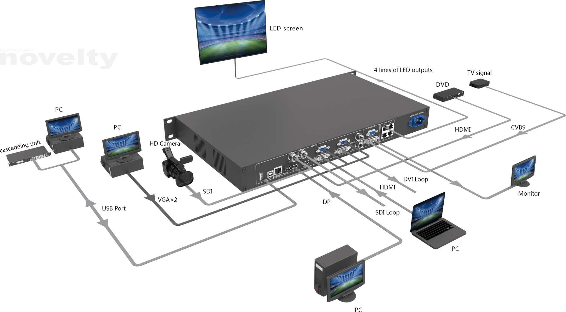 The VX4S is a professional LED display controller. Besides the function of display control, it also features in powerful front end processing, so an external scalar is no longer needed. With professional interfaces integrated, VX4S with excellent image quality and flexible image control greatly meet the needs of the broadcast industry, Its friendly in user-interface. so that the display to work has never been as easier and more enjoyable as with VX4S.- The inputs of the VX4S include CVBS×2, VGA×2, DVI×1, HDMI×1, DP×1 and SDI×1. They support input resolution up to 1920×1200@60Hz; the input images of VX4S can be zoomed point-to-point according to the screen resolution;