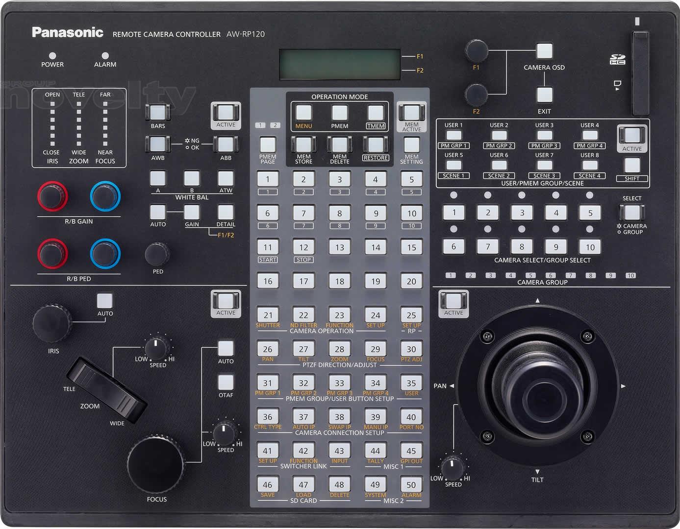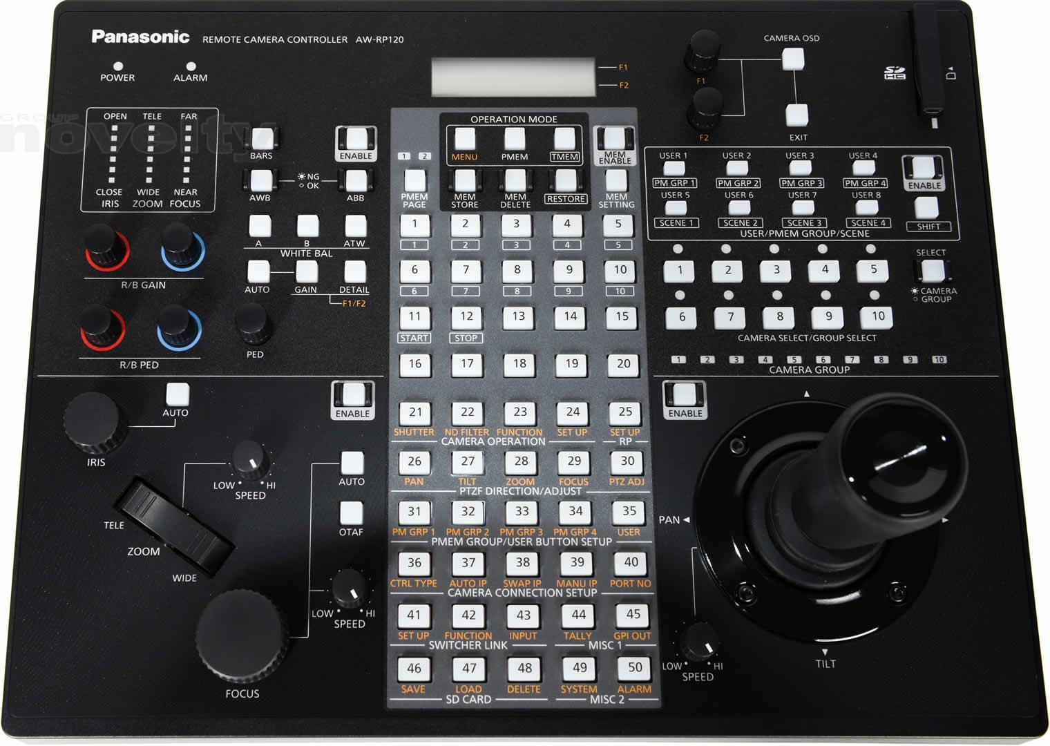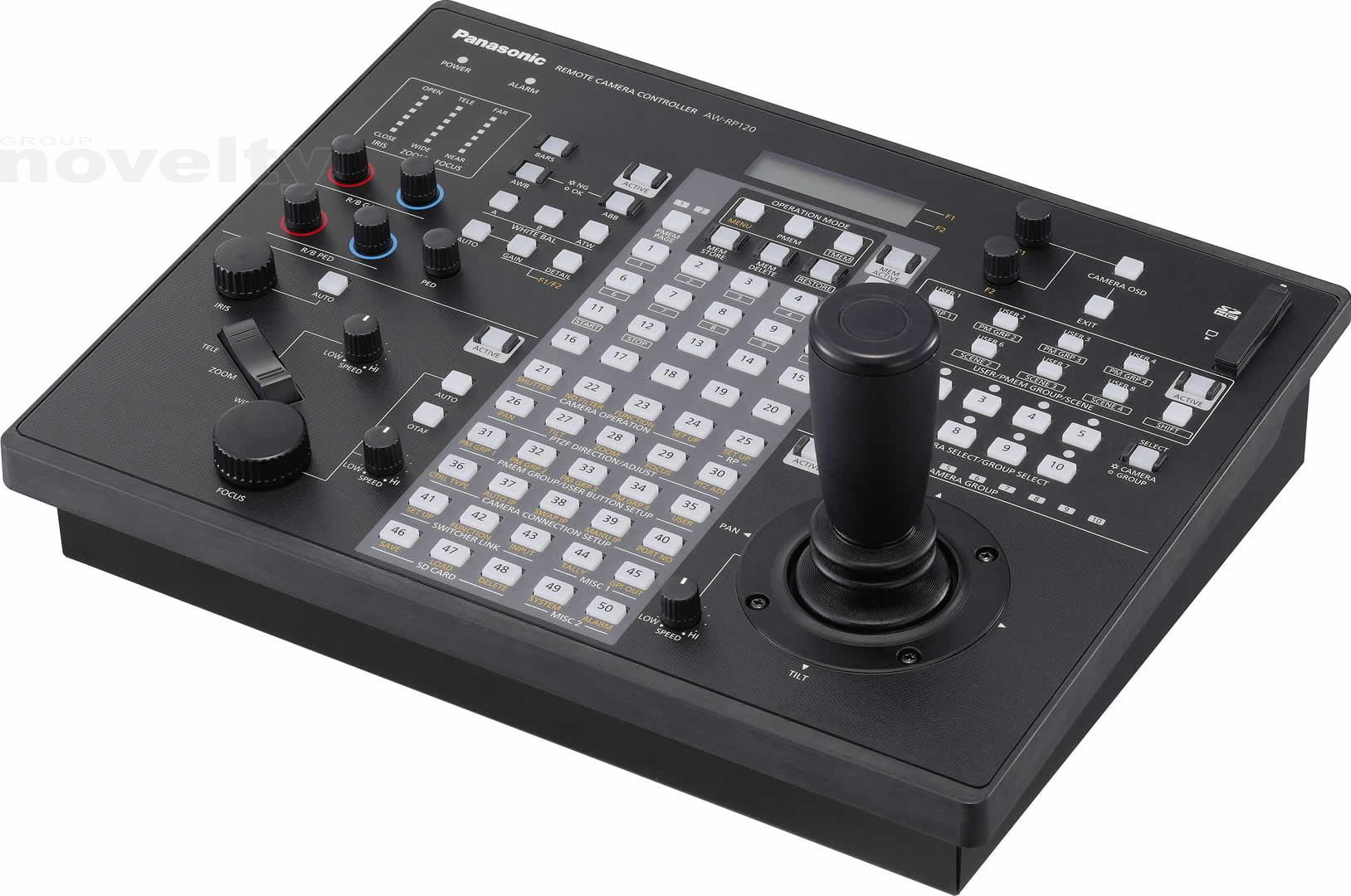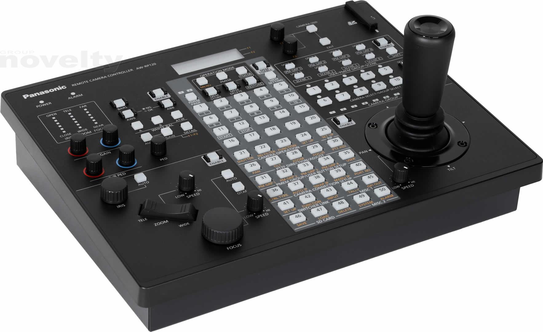La commande à distance permet un réglage direct du gain d'une caméra, d'obturation, de détail, AWB, ABB, Master piédestal, R / B Socle et R / B Gain. Autres fonctions du menu des appareils Panasonic compatibles peuvent être contrôlés aussi à l'aide du RP120. Son écran LCD facilite l'utilisation du menu ainsi que le zoom dédié, l'affichage de l'indicateur et de l'iris mise au point. Diverses fonctions peuvent également être attribuées à huit boutons utilisateur pour le contrôle d'une seule touche. Les fichiers de scène peuvent être utilisés pour la commutation d'une touche de modes de prise de vue de la caméra à distance, et les paramètres peuvent être stockés sur une carte mémoire SD pour les configurations de sauvegarde et de clonage à d'autres contrôleurs.