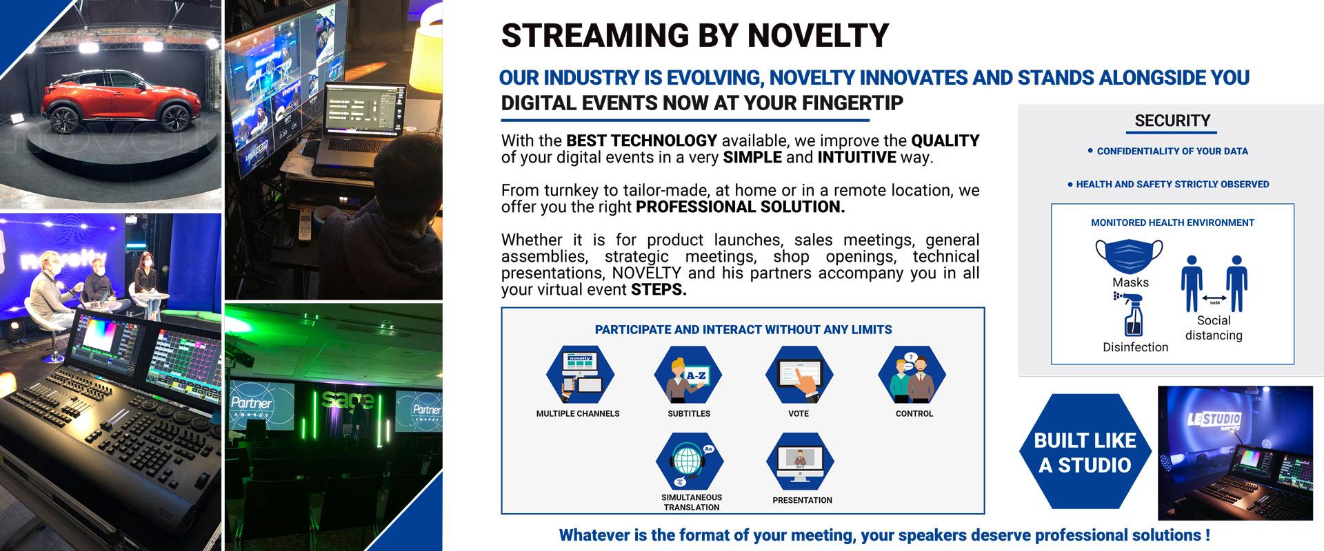 NOVELTY ADAPTS TO YOUR NEEDSWith the BEST TECHNOLOGY available, we improve the QUALITY of your digital events in a very SIMPLE and INTUITIVE way. From turnkey to tailor-made, at home or in a...