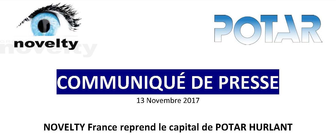 COMMUNIQUÉ DE PRESSE | 13 Novembre 2017NOVELTY France reprend le capital de POTAR HURLANT Encore un nouveau défi et une belle aventure humaine !Le Groupe Novelty, fraîchement...