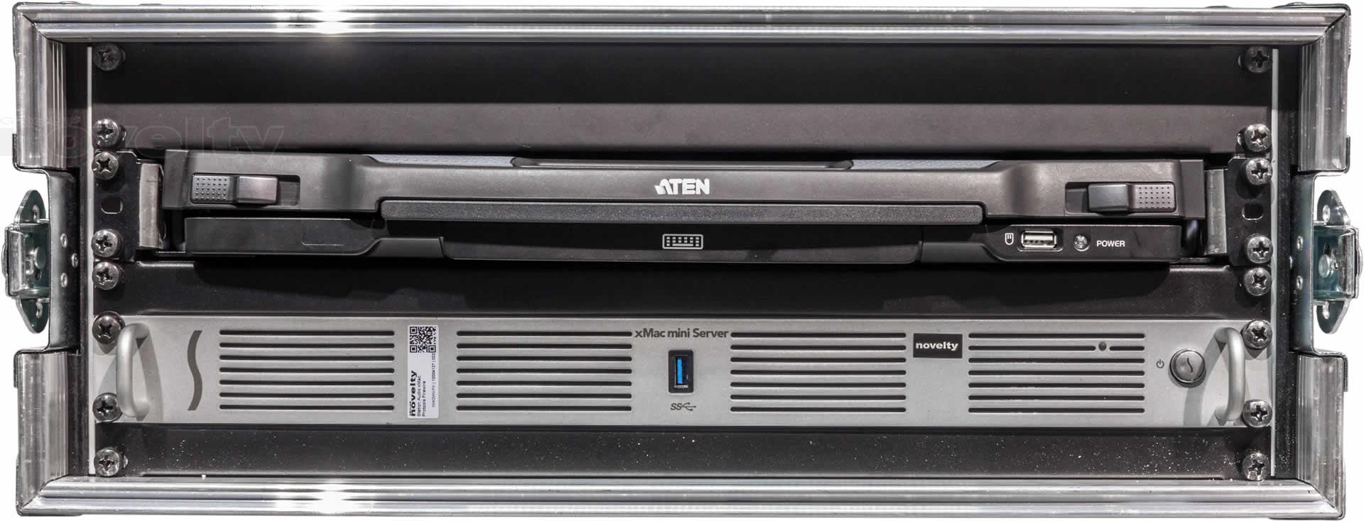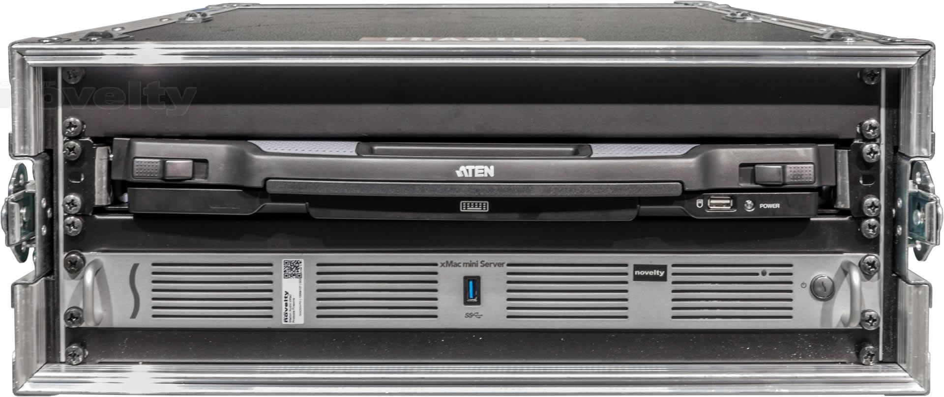 Kit station audio, composée d'un MacMini (quadricoeur Intel Core i7 2,3 Ghz, RAM 4Go, SSD 256Go) + logiciels séquenceurs Logic Pro X + carte audio HDSPe MADI FX + carte virtuelle Dante, monté dans 1 rack 1U avec alimentation