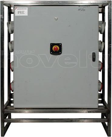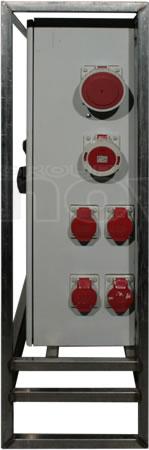 Armoire de distribution sur pied. Entrée : Bornier. Sorties : 2 x P17 125tri + 2 x P17 63tri + 8 x P17 32tri + 2 x PC16A. Protection différentielle 30mA