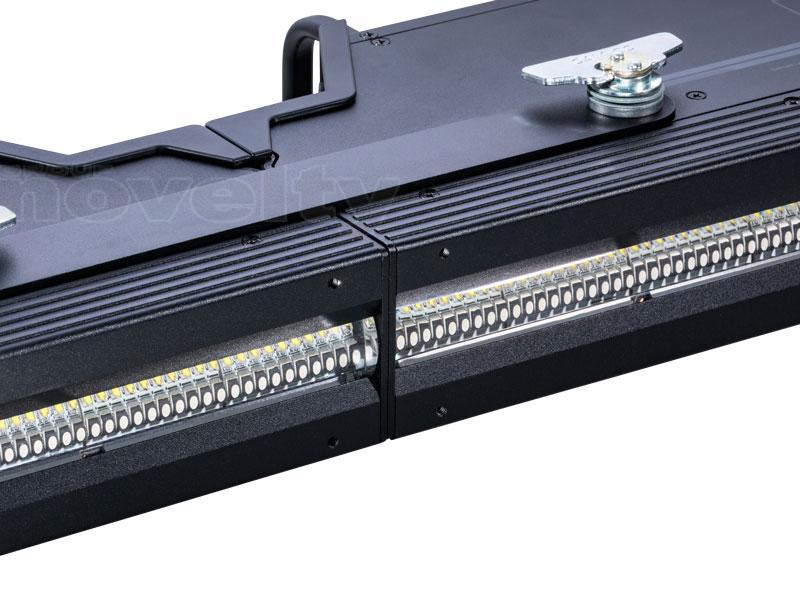 L'unité LED Strobe offre, avec 100 LED à lumière blanche extrêmement puissantes par 500 mm, une luminosité suffisante pour des flashs massifs avec une véritable sensation de stroboscope. La séparation en 20 segments contrôlables individuellement permet des possibilités créatives infinies et des options de pixel mapping impressionnantes.