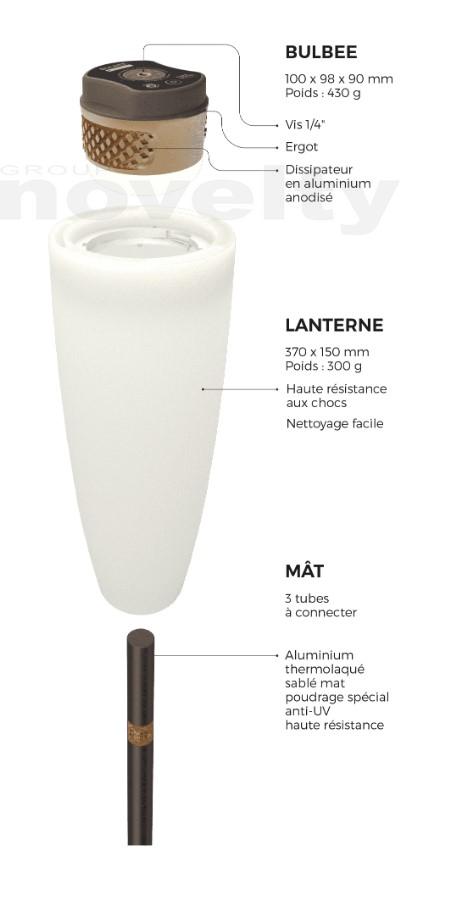 - une lanterne en polyéthylène Haute Densité (grand diffuseur L 37 x l 15 cm – 300 g),