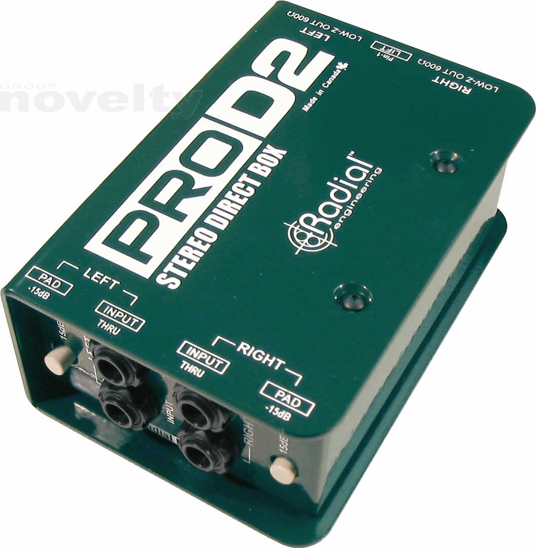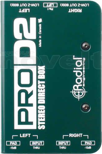The Radial ProD2 is a compact stereo direct box developed specifically to address the needs and challenges of interfacing a stereo keyboard to a professional audio system. This passive DI features two independent channels with separate inputs and thru-puts for the artist's stage amp and two fully isolated outputs for the PA system.