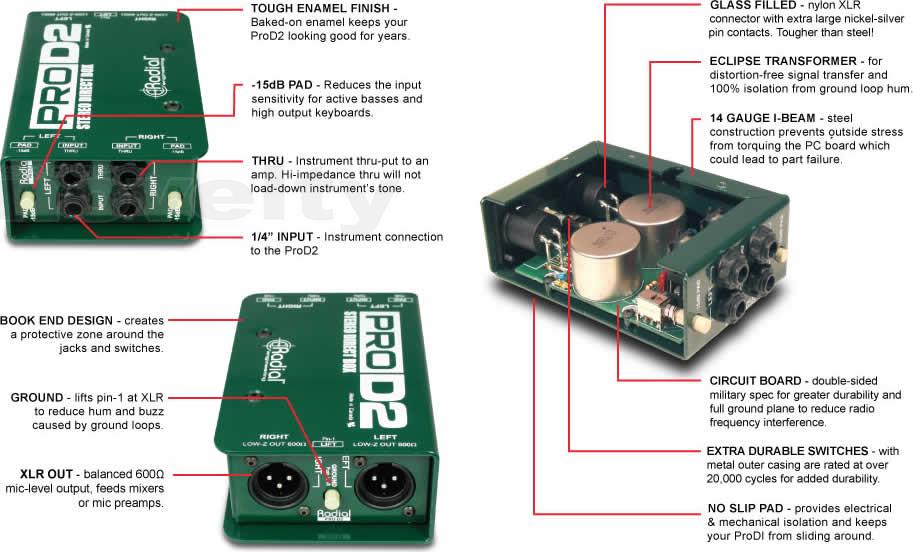 The best feature of the ProD2 is its 'plug & play' ease of use. All you do is connect the instrument to the ¼” inputs, the ¼” through jacks to the stage amplifiers or local mixer and the XLR outputs to the mixing console and you are done. Any distortion? Hit the -10dB pad. Any noise? Just depress the ground lift switch.