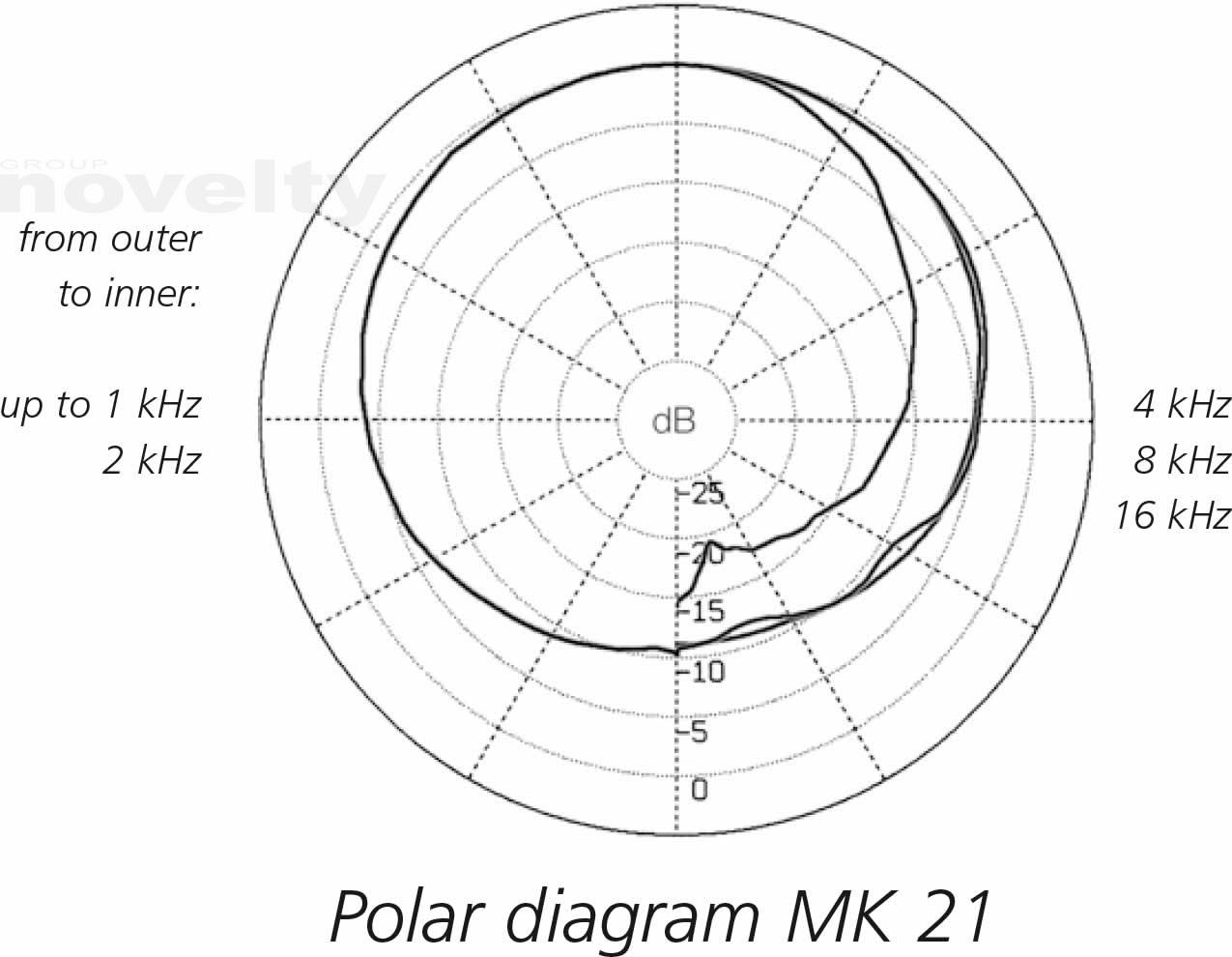 The polar diagram shows the directivity of the MK 21 to be only slightly dependent on frequency. This contrasts with omnidirectional capsules, whose directivity increases with rising frequency, and with cardioids (at least smaller ones), which tend to accentuate high frequencies that arrive at oblique angles.