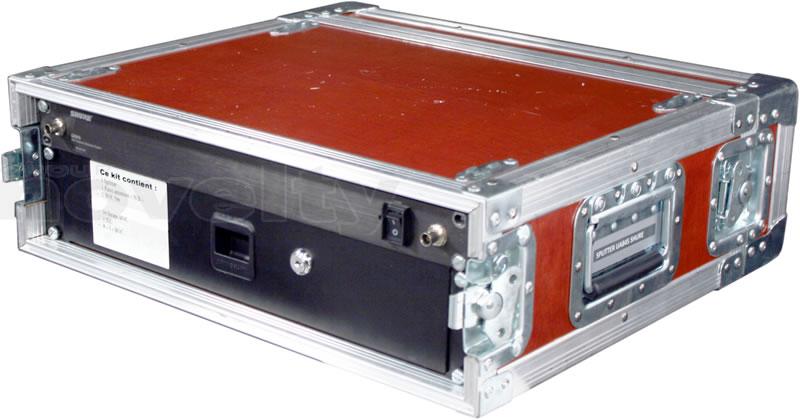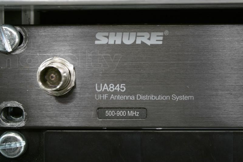 The Shure Model UA845-SWB is an amplified, UHF Antenna Distribution System that expands a wireless microphone system by splitting one pair of antennas to multiple Shure U4, UR4, ULXD4, ULXD4D, or ULXD4Q wireless receivers. It also amplifies RF signals to compensate for insertion loss due to splitting signal power to multiple output connectors. Each UA845-SWB allows up to four receivers to use the same antennas. CASCADE connectors allow connections to a fifth receiver or a second UA845-SWB.