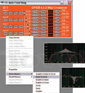 • Two or four inputs, each with gain control, 28-band graphic EQ (choice of responses), 8 filters (each selectable from high/low pass, shelf, parametric, bandpass, allpass, notch, or elliptical), delay.<br /> <br /> • Four, six or eight outputs, each with gain control, polarity, delay, high/low pass filtering up to 48dB crossover slopes, up to 9 filters (each selectable from high/low pass, shelf, parametric, bandpass, allpass, notch, or elliptical.)<br /> <br /> • Matrix any input to any number of outputs, with clear information as to routing, simply by pressing a single input or output EDIT button.<br /> <br /> • AES/EBU digital inputs and outputs built-in and easily selectable. Front panel LEDs keep you informed at all times. Plus a Comms LED so you know your network is all connected up and working fine.<br /> <br /> • Crossover power – choice of type, and roll-off to 6, 12, 18, 24 or 48dB per octave.<br /> <br /> • Two stage RMS and Clip/D-Max limiters available, with look-ahead attack time on the Clip limiter.<br /> <br /> • Up to 96kHz internal processing, and sampling rates up to 192kHz accepted at the input stage.<br /> <br /> • 116dB dynamic range for unsurpassed headroom.Informations
