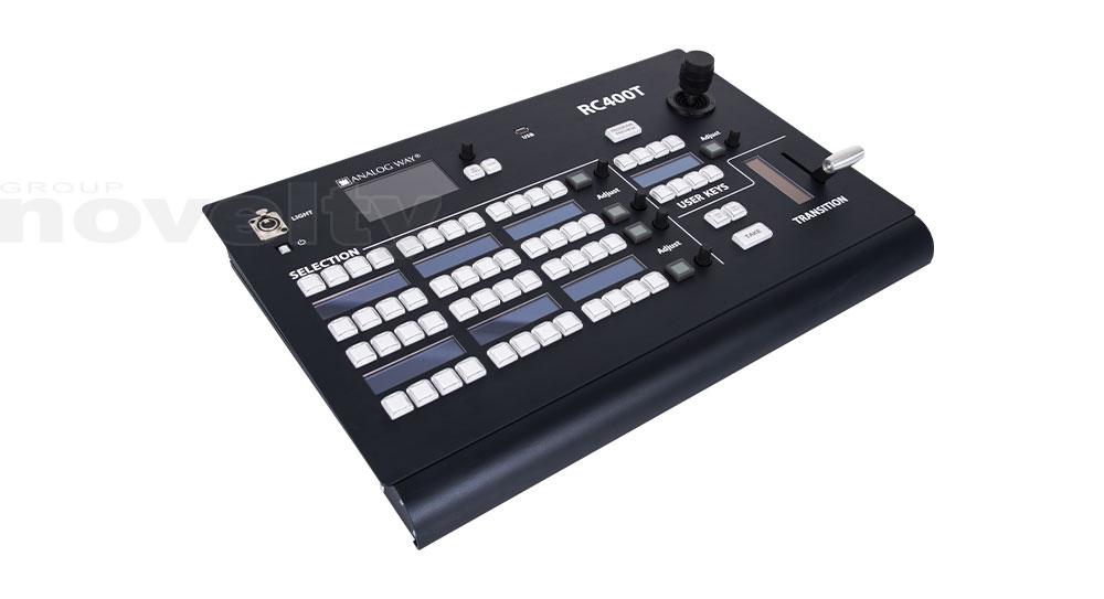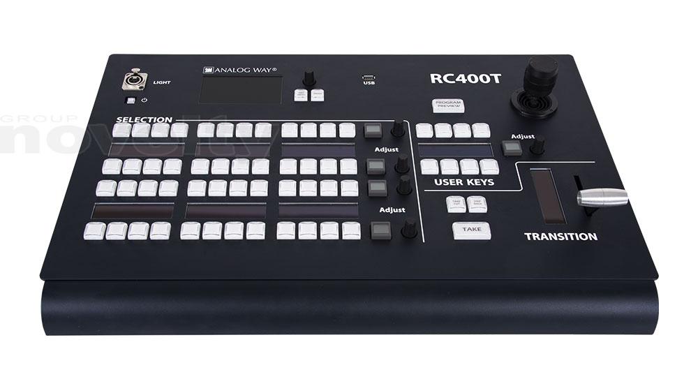 La console de contrôle RC400T a été conçue pour augmenter considérablement le niveau d'efficacité opérationnelle et pour donner un accès instantané aux fonctionnalités les plus importantes des processeurs d'images des gammes LivePremier™, Alta 4K et Midra™ 4K (choix du screen, rappel de mémoires, sélection de la source pour les couches, transition...). Il est possible de contrôler jusqu’à cinq processeurs en parallèle (commutation à la volée). Avec son faible encombrement et son ergonomie avancée, sans oublier ses touches librement personnalisables, son T-BAR haute résolution et son joystick à trois axes, la console de contrôle RC400T offre tous les outils dont vous avez besoin pour maîtriser efficacement vos événements live les plus complexes.